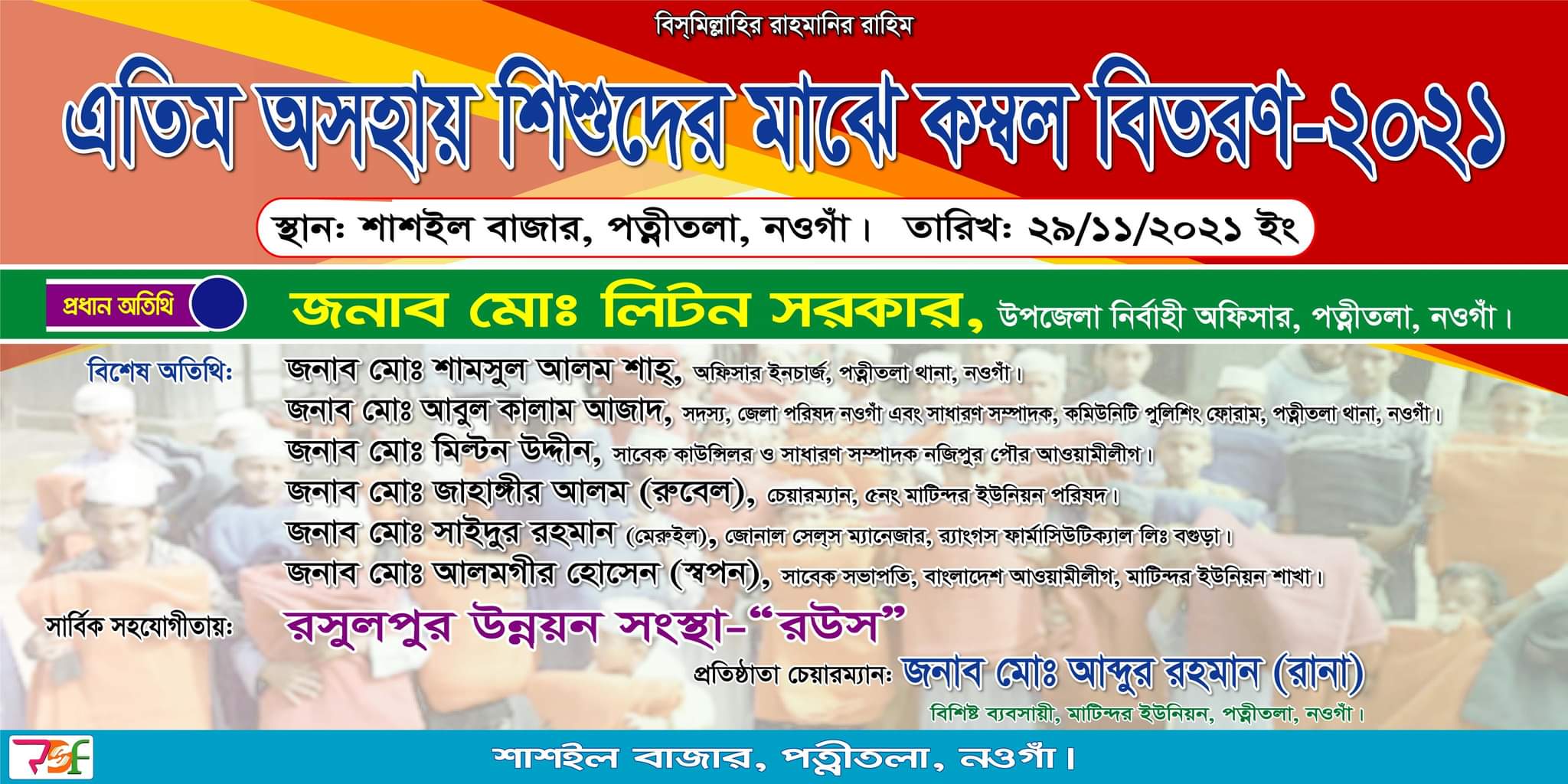 রসুলপুর উন্নয়ন সংস্থা-রউস কম্বল বিতরণ কর্মসূচির ব্যানার